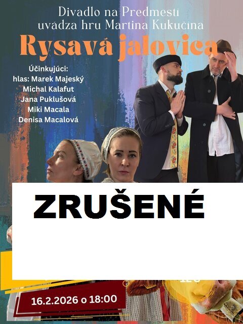 OZNAMUJEME ZÁUJEMCOM, ŽE PREDSTAVENIE RYSAVÁ JALOVICA PLÁNOVANÉ NA 16.,2.2026 SA PRE NÍZKY ZÁUJEM NEUSKUTOČNÍ. ĎAKUJEME ZA POCHOPENIE,